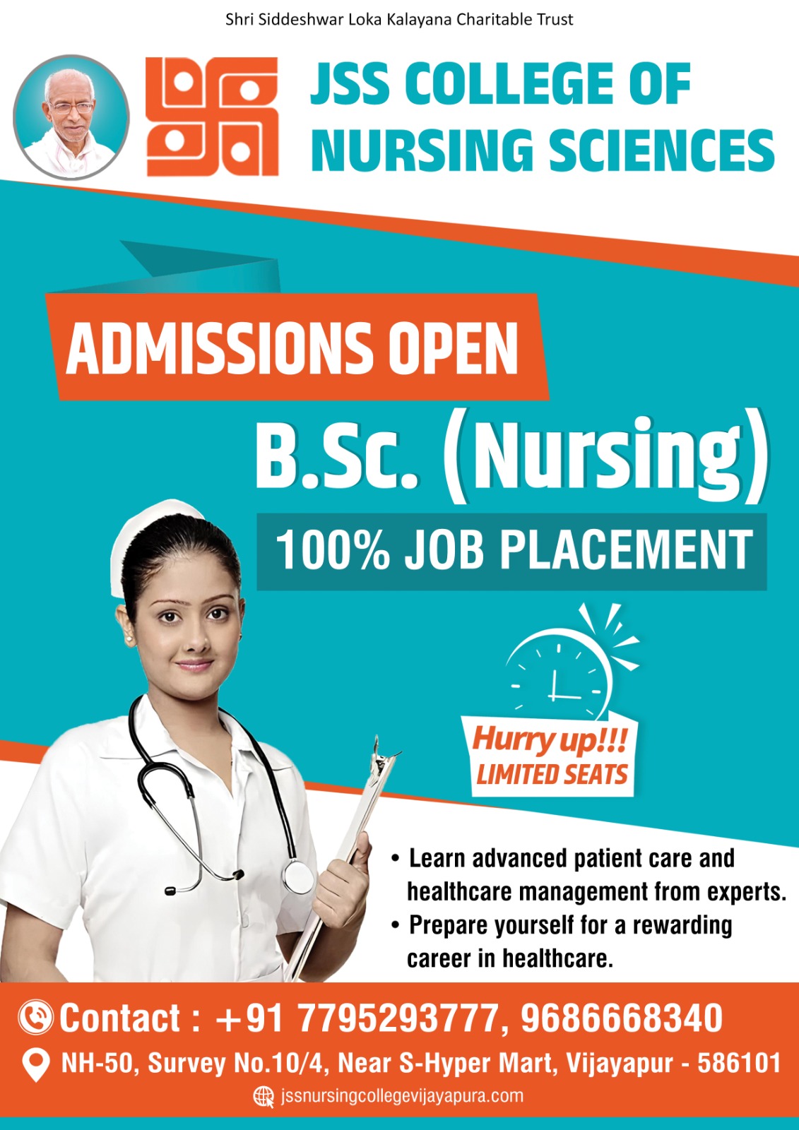 JSS College of Nursing Sciences in Vijayapur, Karnataka, stands as a beacon of excellence in nursing education. With a focus on practical skills and theoretical knowledge, our college equips students with the expertise needed to excel in the healthcare industry. Our experienced faculty members bring real-world insights into the classroom, fostering a nurturing learning environment. State-of-the-art facilities, including simulation labs and clinical training setups, provide hands-on experience to students. We are committed to upholding the highest standards of education and ethics, preparing our graduates to become compassionate and competent healthcare professionals. Join us at JSS College of Nursing Sciences to embark on a fulfilling journey towards a rewarding career in nursing.